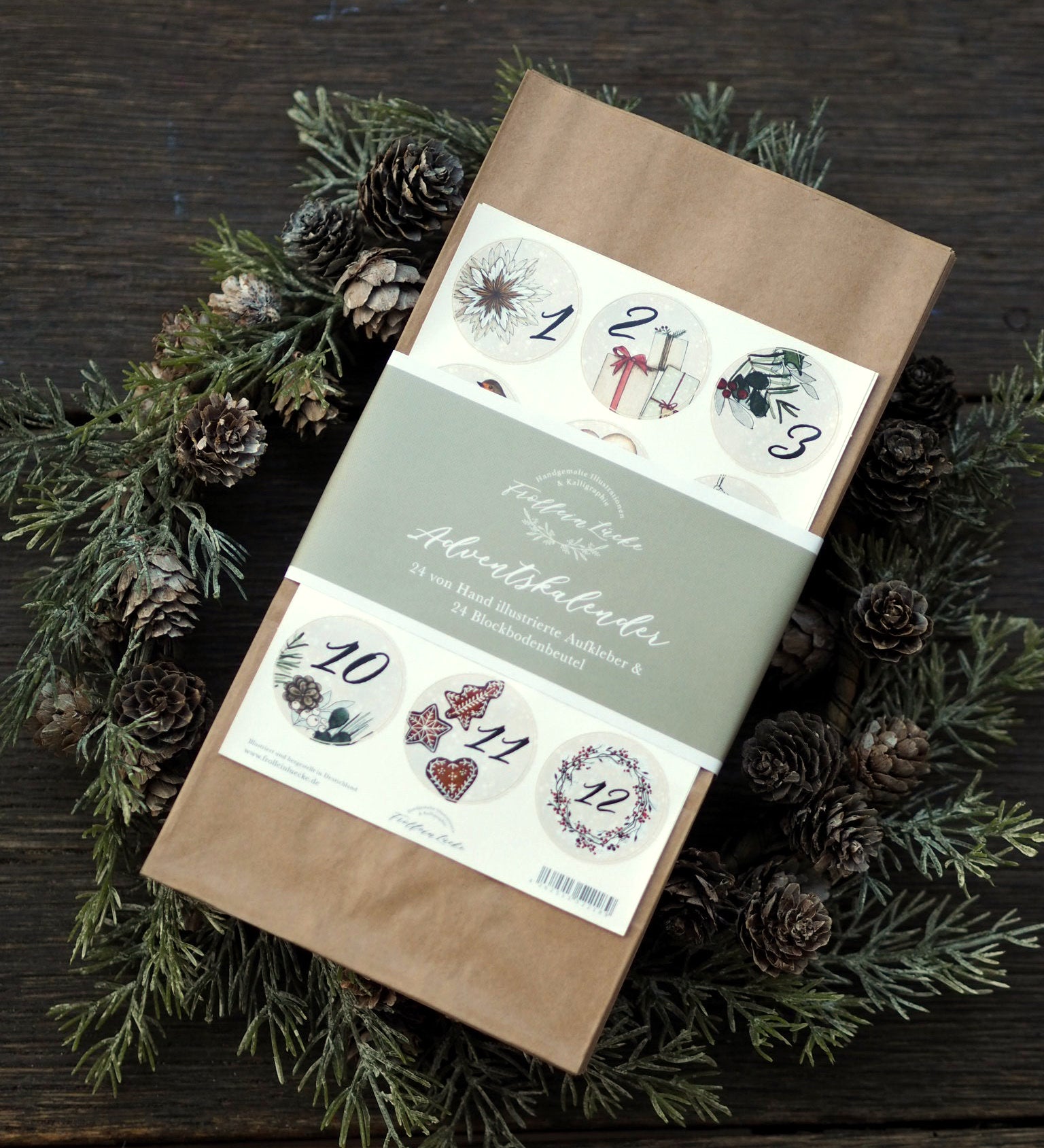 Dieses Adventskalender-Set enthält 24 Kraftpapier-Blockbodenbeutel sowie 2 Bögen mit insgesamt 24 handgemalten Aquarell Aufklebern in weihnachtlichem Design. Damit lässt sich im Handumdrehen ein ganz persönlicher Adventskalender gestalten: Beutel befüllen, Zahlenaufkleber anbringen – fertig ist eine liebevolle Überraschung für die Vorweihnachtszeit. Die Kombination aus natürlichen Materialien und verspielten Illustrationen macht den Kalender zu einem stimmungsvollen Begleiter durch den Advent.