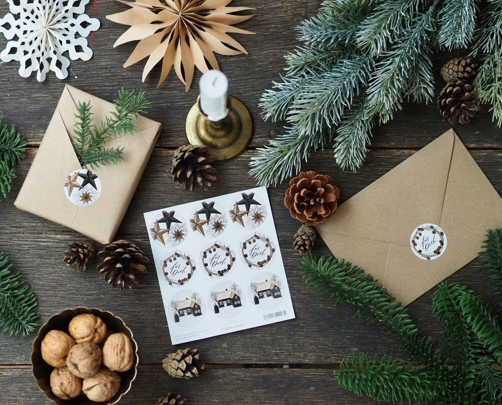 Festliche Aufkleber mit handgemalten Aquarellmotiven, die Geschenken und Briefumschlägen im Handumdrehen weihnachtlichen Charme verleihen.